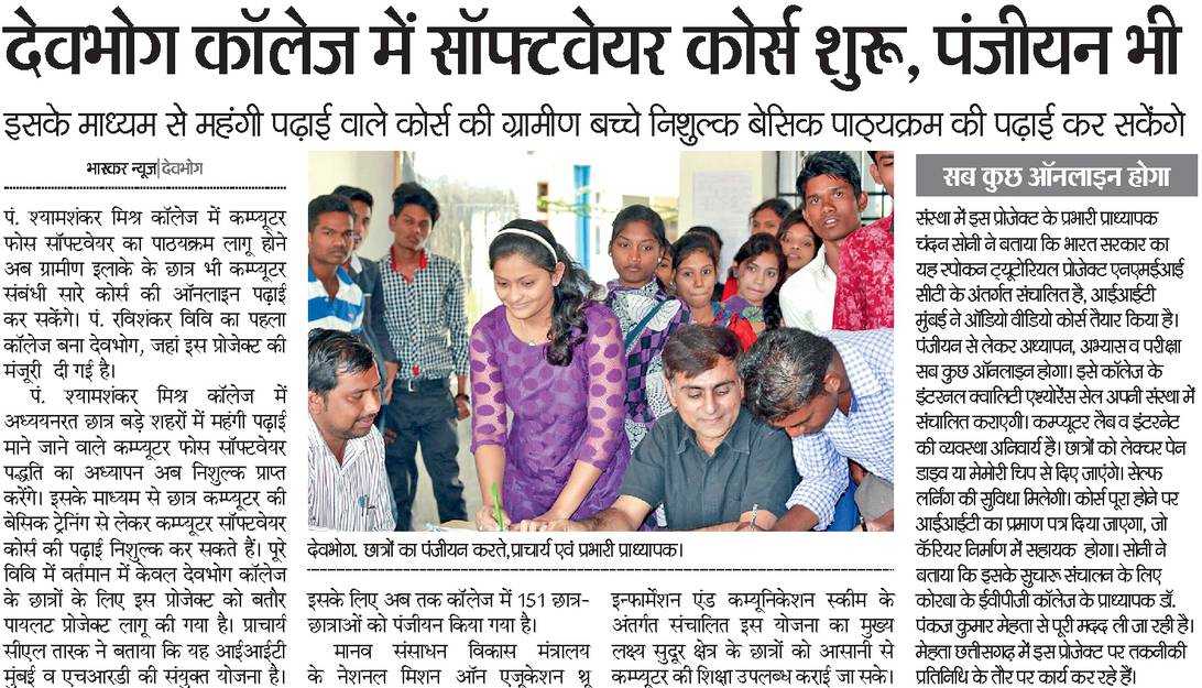 Attached is the news article on students from Govt. Pt. Shyam Shankar Mishra College, Ghariyaband, Deobhog ,Chhattisgarh getting enrolled in Spoken Tutorial Training Program (178 Students trained in 9 sessions in September 2016 On LibreOffice Writer). Deobhog is one of the remotest places in Chhattisgarh .