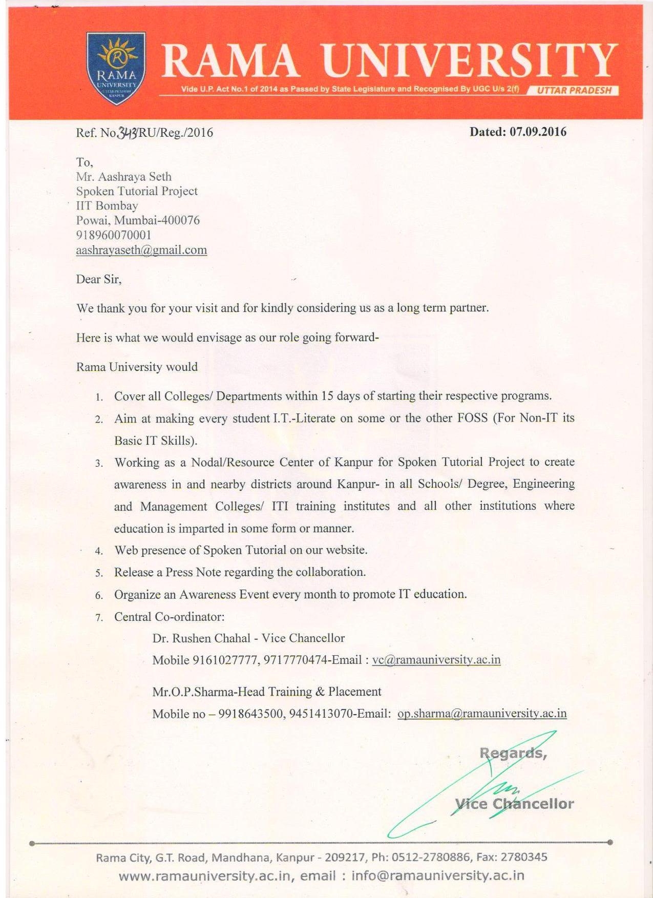 Attached here is the letter from Rama University for implementation of Spoken Tutorial training program.