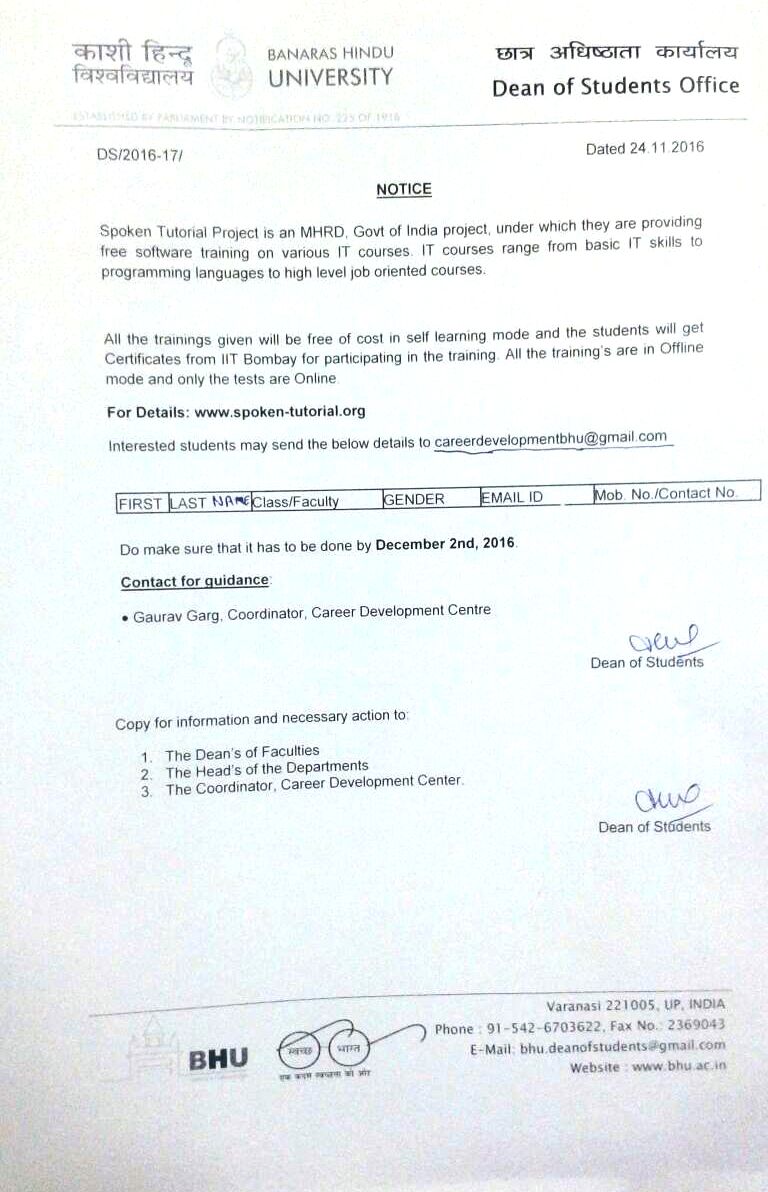 Banaras Hindu University, Varanasi has floated an offline circular to all its departments' heads (Deans) regarding the implementation of Spoken Tutorial Project. The VC has nominated Mr. Gaurav Garg, Head of Career Development Centre, BHU as the Central Coordinator.