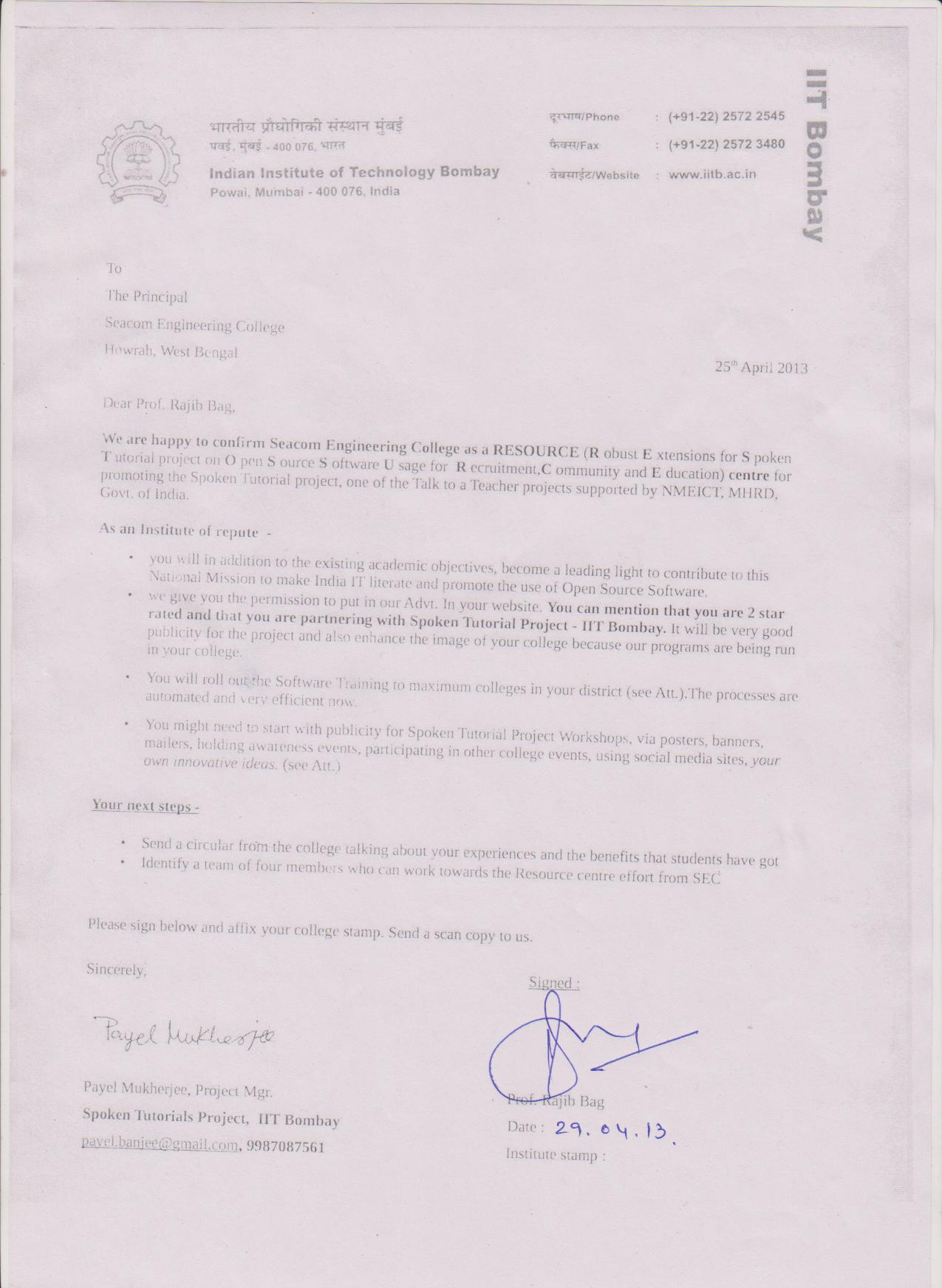 Partnership letter signed with Seacom Engineering College to work as a Resource Centre for Spoken Tutorial.